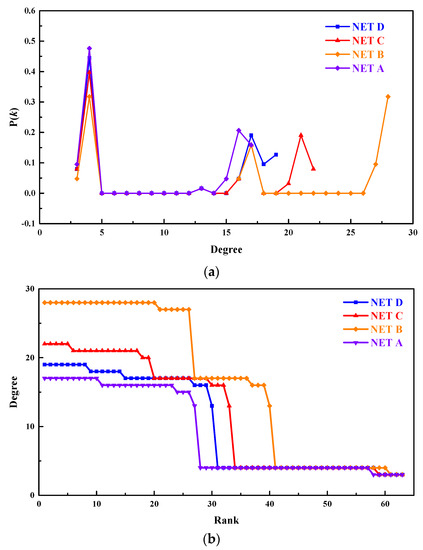 The degree of distribution usually has a significant impact on the performance of information dissemination in a network. Analysis of Figure 4 shows that the overall degree value of Network A is lower than the other three networks. The largest overall degree value is for Network B. The percentage of node degrees below 5 for Networks A, C, and D is 57.14%, 47.62%, and 52.38%, respectively, while only 36.51% in Network B.