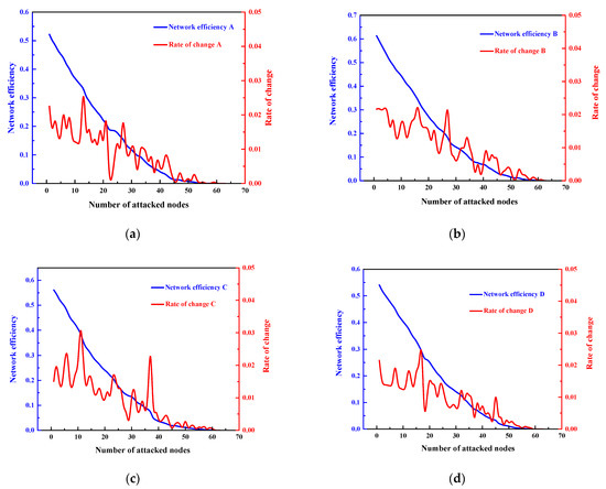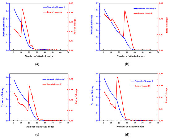 Graph of network efficiency and rate of change under deliberate attack. (a) Network A; (b) Network B; (c) Network C; (d) Network D.