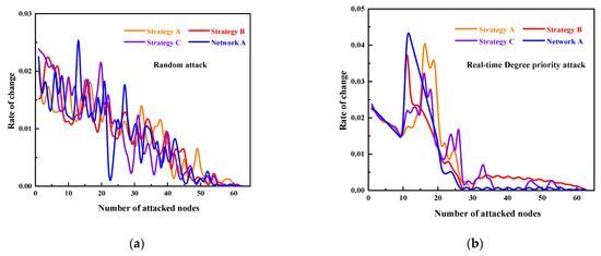 Comparing the rate of change of network efficiency, it can be seen that some nodes in the network have a much higher impact on the network efficiency than others after failure. When random attacks are adopted, the rate of change is not stable and tends to decrease in a “step”, but almost always stays below 0.02; the real-time degree priority attack, on the other hand, has a greater impact on the rate of change of network efficiency, especially in the initial stage.