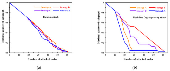 When the real-time degree priority attack is adopted, the maximal connected subgraph drops to a lower level when the proportion of failed nodes in Network A, B, C and D reaches only 40%, 62%, 51% and 46%, respectively, and the network is basically in a paralyzed state; however, when the random attack is adopted, the proportion of failed nodes in Network A, B, C and D needs to reach 86%, 90%, 89% and this indicates that the random attack has a smaller impact on the maximal connected subgraph. The main reason is that the real-time degree priority attack method will give priority to nodes with large degree values. Such nodes are connected to a large number of nodes in the network, and when attacked, the network structure will change dramatically, the network will be split into multiple independent subgraphs, and the destruction resistance will decrease rapidly.
