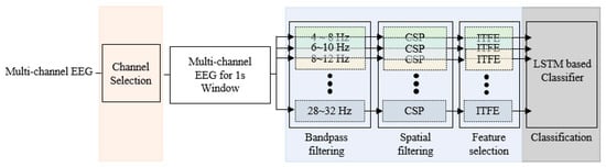 The proposed method performs feature extraction based on overlapping band-based FBCSP (Filter Bank Common Spatial Pattern) and performs classification based on LSTM. This section describes the preprocessing for feature extraction and then explain classification using overlapping band-based FBCSP and LSTM.