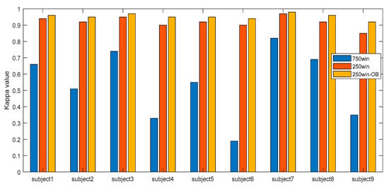 We first compared the kappa values of 750win, 250win, and 250win-OB. As shown in Figure 5, in subject7 with the highest kappa value, 750win was 0.82, whereas 250win was 0.97 and 250win-OB was 0.98. In subject6 with the lowest kappa value, the kappa value was 0.19 for 750win, while it was 0.90 for 250win and 0.94 for 250win-OB. The average kappa value of all subjects in 750win was 0.54, whereas it was 0.92 in 250win and 0.95 in 250win-OB. These results show that the window size, application of a sliding window, and overlap of the bandpass filter greatly affect MI EEG classification results.