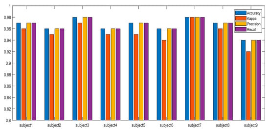 Figure 6 shows the results of an MI EEG classification of 250win-OB. All indicators for subject3 and subject7 appeared higher than other subjects, and subject9 showed lower indicators than other subjects. The average index of all subjects showed 0.97 in accuracy, precision, and recall, and a slightly lower kappa value of 0.95. These results have shown that the algorithm proposed in this study classifies the MI EEG of various subjects quite well.