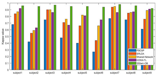 We compared the performance of the existing methods and the 250win-OB method proposed in this study. Figure 7 shows the results of the comparison by kappa value. Through this result, the 250win-OB method shows better performance than other previously proposed methods. Existing techniques showed a large difference in the kappa value according to the subject, whereas the 250win-OB maintained a significantly high value for all subjects. In more detail, FBCSP [30] had an average kappa value of 0.57 and a standard deviation of 0.18 for each subject, SRLDA [67] showed 0.74 and 0.17, shared network [33] showed 0.81 and 0.12, and HDNN-TL [53] showed 0.81 and 0.10. On the other hand, the method proposed in this work showed an average of 0.95 and a standard deviation of 0.02. Therefore, through this comparison, it was shown that the proposed method is more suitable for the MI EEG classification of various subjects than existing algorithms.