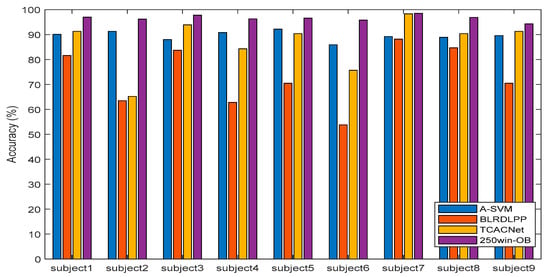 Figure 8 shows the comparison of classification accuracy with existing techniques. A-SVM [68] and BLRDLPP [69] are techniques that extract features and use the machine learning algorithm SVM for classification, while TCANET [70] is a new CNN-based classification technique. The experimental results show that the proposed method in this paper, 250win-OB, which extracts detailed features and learns through deep learning classification, outperforms A-SVM or BLRDLPP techniques that classify with machine learning algorithms after feature extraction, as well as TCANET, which learns with overall deep learning. Through such experiments, our findings showed that the suggested algorithm outperforms other existing algorithms in classifying the four-class MI EEG.