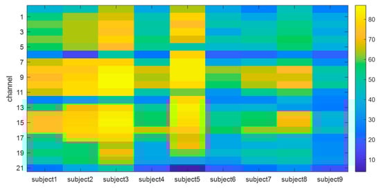 The correlation coefficients between channels are calculated to conduct channel selection for classifying EEG. Figure 9 shows a heat map of the correlation between channels for each user. As shown in the experimental results, the channel correlation coefficient values for each user showed a lot of variation. Subject3 and subject5 show a much higher correlation between channels than other subjects, whereas subject6 and subject9 show a relatively low correlation compared to other subjects. Overall, there are differences in the value of cumulative correlation, but channels with high inter-channel correlation showed high correlation in most subjects.