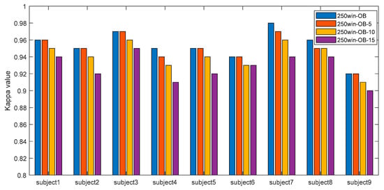 To analyze the effect of the number of channels on the classification accuracy, the results using all 22 channels and the results after removing channels with high correlations were compared. The number of channels to be removed can be specified, and in this experiment, the results after removing 5, 10, and 15 channels were compared with the results using all channels, and the results are shown in Figure 10 with the comparison of kappa values. The proposed 250win-OB method was used in the experiments.