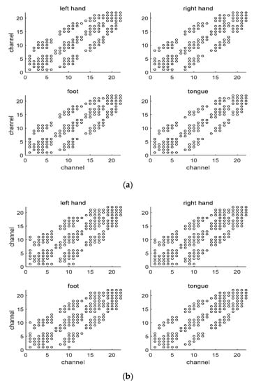 Pearson’s correlation coefficient is used to find channel correlation for subject’s MI in channel selection task. We calculated the correlation coefficient between channels for each MI and determined that the correlation between the two channels was high when the absolute value of the correlation coefficient is greater than 0.8. MICoeffj,k,l, which stores high correlation information between channels for each MI, is calculated by Equation (5) and stores 1 if the correlation between channel j and channel k in the lth motion is high or 0 otherwise, where l is the lth MI for each subject and j and k mean the jth and kth channels.