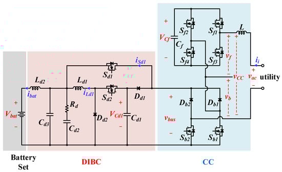 Although the CADPCI performs unity power factor correction, the instantaneous input power from the utility includes not only a DC power but also a twice-utility-frequency AC power. The twice-utility-frequency AC power results in a ripple current on the DC side of the CADPCI that charges the battery set. This ripple current may reduce the life of the battery set [,]. The novelty of the DIBC is that the buck converter in the DIBC not only regulates the DC port voltage of the BLR but also acts as a DAF to filter out low-frequency ripple of the charging current for the battery set.