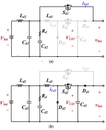 The input voltage of the DIBC has two levels: the voltage of the battery set (Vbat) and the input voltage of the buck converter (VCd1), depending on the operation of the selector switch Sd1. The DIBC operates in two modes, according to the selector switch, as shown in Figure 4.