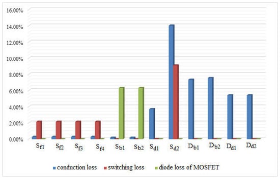 where D is the duty cycle of the FBC and fp is the frequency of the pulse voltage for the FBC. The FBC uses unipolar PWM control, so fp is twice the switching frequency of the power electronic switches. Since the difference in each voltage level is greatly reduced, and fp is multiplied, the filter inductor is significantly reduced in the proposed CC. Moreover, only the FBC is switched in high frequency. The DC port voltage of the FBC is about one-fifth that of a conventional PFC circuit; hence, the switching loss for the proposed CC is reduced significantly. The conduction resistance of MOSFET is proportional to its voltage rating. Hence, the conduction loss of FBC is low. Moreover, the input voltage of the buck converter is four-fifths as compared with that of the conventional PFC circuit, so the switching loss of the buck converter in the DIBC is also reduced. Although the proposed CADPCI uses a large number of components, its power efficiency is better than that of the conventional PFC circuit. In addition, the capacity of the passive filter and the EMI of the proposed CADPCI is significantly reduced as compared with the conventional PFC circuit. The DC port voltage of FBC in the proposed CC is also less than that in the asymmetrical CC with a DC port voltage ratio of 1:3, which is a quarter of the DC port voltage for the conventional PFC circuit. Therefore, the switching losses, the capacity of the passive filter, and the EMI of the proposed CC can be further reduced as compared with the asymmetrical CC with a DC port voltage ratio of 1:3. Figure 7 shows the percentage loss for the power semiconductor components in the CADPCI by using a thermal module of PSIM. For CC, the switching loss is significantly reduced. The largest loss in the CADPCI is the switching loss and conduction loss of Sd2 of the DIBC.