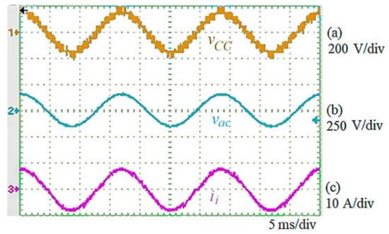 Experimental results for the AC side of the CC: (a) AC port voltage of CC; (b) utility voltage; (c) input current.