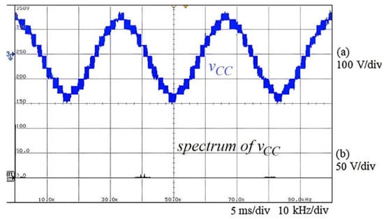 Figure 15 shows the experimental results for the voltages at the AC side of the CC. Sb1 and Sb2 are switched synchronously with the utility voltage, so the AC port voltage of the BDR, which is shown in Figure 15c, is a five-level step-wave voltage. The control for the FBC uses unipolar PWM. Figure 15b shows that the FBC generates a three-level high-frequency pulse voltage. The AC port voltage of the CC is the summation of the AC port voltages of the BLR and the FBC, so an 11-level AC voltage is generated, as shown in Figure 15a.