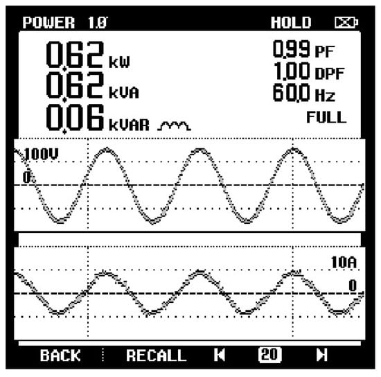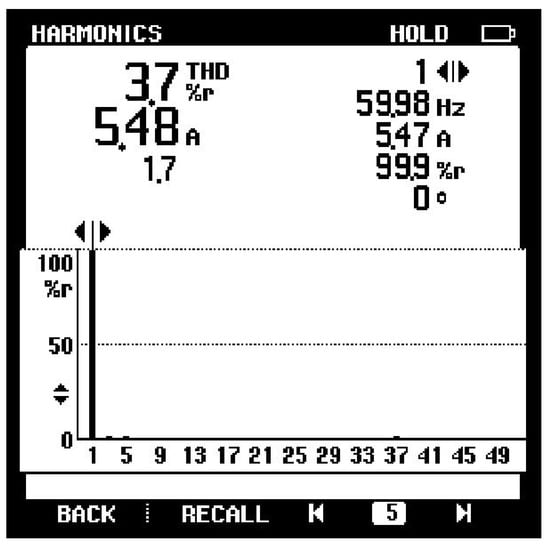 Figure 11 shows the experimental results for the AC side of the CC in the steady state. Figure 11a,b show that the AC port voltage of the CC is an 11-level voltage and is synchronized with the utility voltage. Figure 11b,c show that the input current of the CC is a sine-wave current that is in phase with the utility voltage, so the power factor is close to unity. Figure 12 shows the voltage waveform and frequency spectrum for the AC port voltage of the CC. The dominant harmonics for the AC port voltage of the CC appear at around 40 kHz, which is twice the switching frequency of the FBC. The AC port voltage of the CC is an 11-level voltage, so the amplitude of the dominant harmonics is very small. Therefore, the filter inductor in the prototype is very small. Figure 13 shows the total harmonic distortion (THD) of the input current of the CC. The THD of the input current of the CC is only 3.7%. Figure 14 shows the power factor of the CC. The power factor of the CC is close to unity.