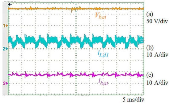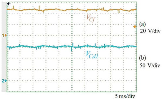 To verify the performance of the proposed CADPCI, an 800 W prototype was developed. Figure 10 shows the photo of the prototype. The circuit parameters of the prototype are shown in Table 1. The CADPCI is connected to a single-phase utility of 110 V and 60 Hz, and six batteries are connected in series to form the battery set. Considering the level voltage overlap for the AC port of the CC, the set voltage I for the DC port voltage of the FBC is 43 V.