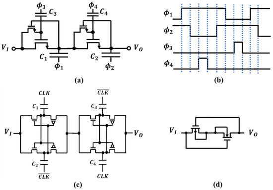 Various charge transfer switches (CTSs) have been proposed to reduce the effective threshold voltage (VTH) per CTS. Umezawa et al. proposed effectively zero VTH CTS by using a four-phase clock [16], as shown in Figure 2a,b. C1 and C2 are the stage capacitors which mainly determine the circuit area. The other capacitors can be small, which aim at boosting the gate of CTSs. After the gate node is left floating, the small gate-boosting capacitors C3, C4 allow the transfer transistors to operate in triode region, resulting in effectively zero VTH. Gariboldi et al. proposed CTS with a CMOS latch or cross-coupled CMOS with two-phase clock [17], as shown in Figure 2c. A stage capacitor is halved for each of the two capacitors C1, C2 to remain the same stage capacitance in total. Charges can be fully transferred from C1 to C3 with CLK high and /CLK low in the first half period. Charges can be fully transferred from C2 to C4 with CLK low and /CLK high in the second half period. As a result, the same amount of charge can be transferred from one stage to the next in one clock cycle. Levacq et al. proposed an ultralow-power diode (ULPD) [18], as shown in Figure 2d. In a forward biasing condition, either the NMOSFET or the PMOSFET with a lower threshold voltage determines the forward bias current. In a reverse biasing condition, a significant reduction in off-leak current is expected.