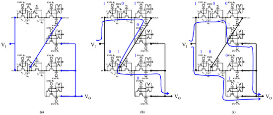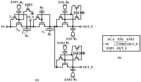 Figure 4a shows the schematic diagram of two-stage unit based on the structure of Figure 2a. Control signals ENP1, ENP2, and ENS determine the charge transfer path among IN-to-OUT_S, IN-to-OUT_P, IN_S-to-OUT_S, and IN_S-to-OUT_P. Figure 4b illustrates a symbol of the two-stage unit.