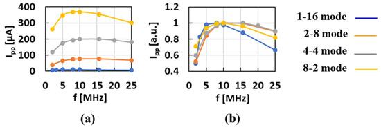 Determination of the optimum combination of C and N for a given VOC was demonstrated in [22]. f is set at the predetermined value which maximizes IPP at VPP_TGT [24]. In other words, the predetermined value of f can minimize the CP area to output a target IPP at VPP_TGT. To determine f, IPP at VPP_TGT of 3.0 V was measured as a function of f with SPICE. Four CP configurations, as discussed below in detail, were tested in the case of (N, C) of (2, 160 pF), (4, 80 pF), (8, 40 pF), and (16, 20 pF), namely, 8-2, 4-4, 2-8, and 1-16 modes at VOC of 2.0 V, 1.5 V, 1.0 V, and 0.5 V, respectively, as shown in Figure 6a. Figure 6b shows IPP normalized by the maximum value in each configuration. Regardless of configuration, f of 8–10 MHz gave the maximum output current. Thus, f of 10 MHz was selected in this work.