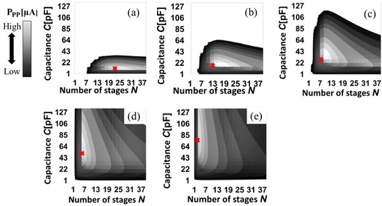 Unlike a given VOC in [22], how the optimum combinations of C and N vary with VOC was the concern in this paper. Figure 7 shows the contour plots of the output power POUT over the C–N plane in the case of VOC = 0.5 V (a), 0.7 V (b), 1.0 V (c), 1.5 V (d), and 2.0 V (e) [25]. Points in red indicates the optimum combinations of C and N, namely, COPT and NOPT, respectively, which enable CP to generate the largest POUT.