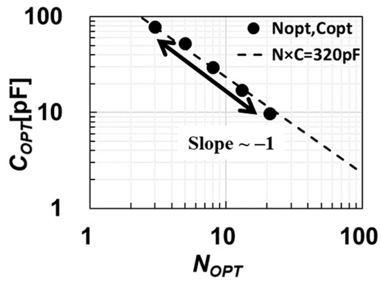 Figure 8 shows how COPT and NOPT vary with VOC. The slope of the approximate line is −1, which suggests that their product, i.e., the CP area, should be constant. Intuitively, as VOC decreases, N needs to increase to remain the voltage gain from the input to the output. If C is unchanged, the input current should increase with larger N. This means that the input impedance would decrease. To keep the impedance matching at the interface between TEG and CP, C needs to decrease as N increases. Conversely, as VOC increases, N must decrease whereas C must increase to keep the voltage gain and the input impedance at the same time. To operate CP in MPPT at the CP output, one needs to design CP so that N can vary while C can vary inversely proportional to N when VOC varies. As a result, the following functionalities are needed: (1) periodical detection of VOC, (2) determination of C–N combination for the present value of VOC, and (3) reconfiguration of CP to have COPT and NOPT for the present value of VOC. In Section 4, the design is demonstrated. This procedure can be called a one-dimensional MPPT because one only needs to determine the combination of COPT and NOPT for the present value of VOC.