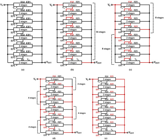 In [15], a reconfigurable CP with fine-tuning capability to allow N of 1, 2, 3, 4, or 5 was proposed. As a result, 12 capacitors and 88 switches are needed for the five-stage CP. Many switches increase parasitic capacitance to the stage capacitors, which can affect voltage gain and power efficiency. Instead, another reconfiguration approach [21,22] was used to minimize the area overhead in this paper. Sixteen switches are added to the original 16-stage CP to allow CP to have two, four, eight, and 16 stages depending on the measured value of VOC, as shown in Figure 8. Figure 9 shows a reconfigurable CP with eight two-stage units. With the signals in red are high and those in black are low, it can be reconfigured as a single-array 16-stage mode (1-16 mode), two-array eight-stage mode (2-8 mode), four array four-stage mode (4-4 mode), or eight-array two-stage mode (8-2 mode), as shown in Figure 9b–e. The lines in red show the conduction paths.