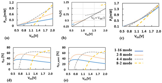 Figure 10a–e show POUT, VS, PS, ηCP, and ηCP_MPPT as a function of VOC, respectively, in different modes. The aim of this work was to achieve MPPT at the CP output. According to Figure 10a, the boundaries in VOC between 1-16 and 2-8 modes, between 2-8 and 4-4 modes, and between 4-4 and 8-2 modes are 0.55 V, 1.05 V, and 1.80 V, respectively. When the CP operates with 1-16, 2-8, 4-4, and 8-2 modes in VOC < 0.55 V, 0.55 V < VOC < 1.05 V, 1.05 V < VOC < 1.80 V, and 1.80 V < VOC, respectively, one can maximize POUT regardless of VOC. Figure 10b shows VS under the CP operation in MPPT. As suggested in [22], VS in cases where CP operates in MPPT for the output (VMPPT_OUT) is basically larger than that in cases where CP operates in MPPT for the input (VMPPT_IN), even though there are tiny ranges in VOC where VMPPT_OUT < VMPPT_IN. Figure 10c indicates that the input power to the CP converses as VOC increases. As a result, power efficiency ηCP or ηCP_MPPT is maximized, as shown in Figure 10d or Figure 10e, where ηCP and ηCP_MPPT are defined by Equations (5) and (6), respectively [15].