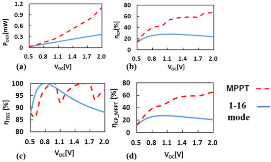 Figure 11a–d show POUT, ηCP, ηTEG, and ηCP_MPPT as a function of VOC, respectively, in MPPT and fixed 1-16 modes. ηTEG is defined by Equation (8) showing how much power is actually input to the CP normalized by PAV.
