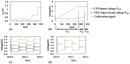To validate the design, VOC shown in Figure 13a was input. VOC was varied from 0.5 V to 0.7 V and to 1.2 V. To save the simulation time, a step response in VOC was used. VPP was regulated at 3 V in 1-16 mode. After CP entered in steady state, a calibration signal was input with high in 100 ns. CP was reconfigured to 2-8 mode. Figure 13c shows 16 capacitor voltages in TM1. Only eight signals are visible because the same stage voltages of two arrays of the eight-stage CP were overlaid. Similarly, Figure 13d shows 16 capacitor voltages in 4-4 modes. Only four signals are visible because the same stage voltages of four arrays of the four-stage CP were overlaid. The ripple in VPP increased from TST to TM2 with IPP, which means that output power increased with VOC.