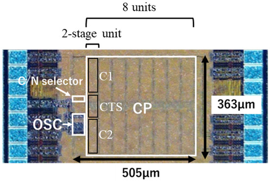 A part of the CP system was implemented in 65 nm CMOS to validate the design, as shown in Figure 14. Eight two-stage units were placed in order horizontally. CTS and small gate boosting capacitors were placed in the center. Clock and control signals were routed over the CTS region. Thus, additional circuit elements for CP to run with MPPT were minimal. The on-chip oscillator generated four clocks at 10 MHz. In this design, two-bit signals were input to select one among four configuration modes externally, instead of using ADC.