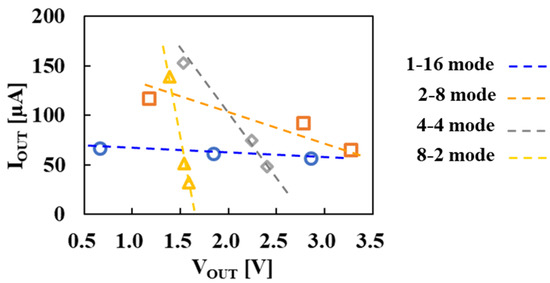 Figure 15 shows the measured VOUT–IOUT at VS of 0.6V. CIN and COUT of 1 nF were connected to the circuit. The slope in each mode was proportional to fC/N. The expected ratios between 1-16 and 2-8 modes, between 2-8 and 4-4 modes, and between 4-4 and 8-2 modes were as large as a theoretical value of 4 (a factor of 2 from C and another factor of 2 from N). According to the measured maximum attainable output voltage, the effective threshold voltage was estimated to be 50 mV. Thus, VOUT–IOUT curves in different modes were verified. Unfortunately, further measurement was not possible because all three fabricated dies were broken by accident.