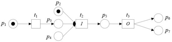 Figure 1 gives an example of logical Petri nets, denoted by LPN. For LPN, , , , , , .  is a traditional transition;  is a logical input transition, and ;  is a logical output transition, and . Under the marking , both p1 and p2 contain a token; at this time, t1 is enabled. After t1 is fired, p3 contains a token; when t2 is fired, p5 contains a token; p2 and p4 do not contain any tokens at the same time.