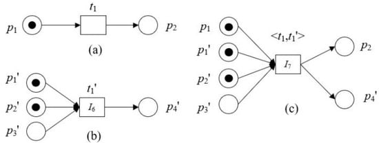 For  and , , , , at this time,  and  can perform synchronous intersection operations to make  and  merge together; it can be recorded as , and replace  and . A new logical Petri net  is obtained by PN1 and LPN2 after the synchronous intersection operation. The acquisition of the new net consists of several aspects: the set of activities composition, the set of places composition, the set of transitions composition, the set of directed arcs composition, mapping I composition, mapping O composition, marking composition, and mapping  composition.