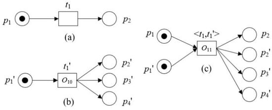 We define the meaning of the synchronous transition unit  as a transition, which is approximately similar to what is represented by transitions ti, tj and has all the characteristics of transitions ti, tj. In fact,  is obtained by performing synchronous mergence and synchronous intersection operations on the transitions ti, tj. Therefore, the synchronous transition unit is essentially a transition. Its nature, characteristics and meaning are the same as those of a transition, but the denotation approach is different. Its purpose is mainly to replace the original transition in the appropriate scene, to make a unified symbolic representation and to distinguish it from the traditional and logical transitions.