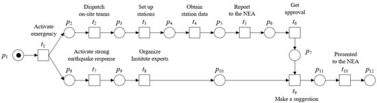 Based on the EOI emergency response workflow in Section 5.1, a set of activities can be extracted. A12 = {Activate emergency, Dispatch on-site team, Set up stations, Obtain station data, Report to the NEA, Get approval, Activate strong earthquake response, Organize Institute experts, Make a suggestion, Presented to the NEA}; a traditional Petri net model  about the EOI can be developed based on this and in conjunction with the emergency response workflow of the EOI. For , , , and , Figure 4 shows the specific structure of the PN12 model.