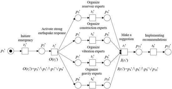 Based on the STD emergency response workflow in Section 5.1, a set of activities can be extracted. A13 = {Initiate emergency, Activate strong earthquake response, Organize reservoir experts, Organize construction experts, Organize vibration experts, Organize gravity experts, Make a suggestion, Implementing recommendations}, a logical Petri net model  about the STD can be developed based on this and in conjunction with the emergency response workflow of the STD. For , , , , , , , , and . Figure 5 shows the specific structure of the PN13 model.