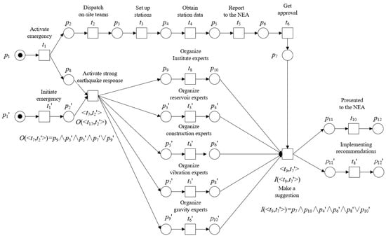 In the synchronous intersection operation of PN12 and LPN13, two synchronous transition units  and  are obtained by synchronous intersection operations of the transitions t7, t2′ and t9, t7′. The synchronous intersection operation of PN12 and LPN13 achieves the collaboration between the EOI and the STD for the tasks of “Activate strong earthquake response” and “Make a suggestion”, which solves the problem of cross-departmental collaboration.