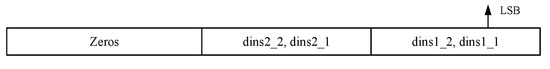 The preprocessor’s architecture, as shown in Figure 3, consists of the input cache: Input Buffer (IB), the Block Splicing (BS), the output cache: Output Buffer (OB), and the global controller: Global Control (GC). The external module gives LDPC-related parameters (usually provided by the baseband frame parsing module, which is not discussed in this paper) and LLRs information. The preprocessor first stores the LLRs information in the IB. The highest modulation, the maximum number of antenna streams Nss, and the quantization of the bit width Q determine the bit width size of the IB, and the bit width sizes in various configurations are shown in Table 2. Suppose the maximum modulation supported by the system is 256 QAM, and the maximum number of antenna streams is two, taking the dual-stream Quadrature Phase Shift Keying (QPSK) as an example. In that case, the input data format is shown in Figure 4. Where in the effective bit widths dins1_1, dins1_2, dins2_1, and dins2_2 represent the soft information of the 1st bit, the 2nd bit in antenna 1, the 1st bit, the 2nd bit in the antenna 2, respectively. The number of effective bits may be less than the maximum bit widths to maintain pattern compatibility, and the remaining bits can be filled with zero.