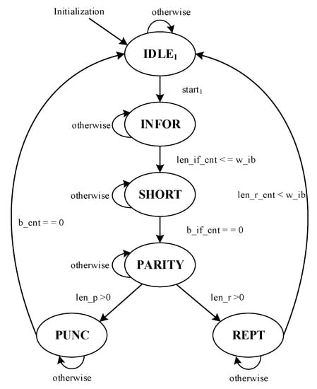 Block stitching is the next layer of field stitching, and block stitching is carried out based on the output of the IB and the corresponding valid bit length. Figure 7 shows the state diagram, with a total of seven states: