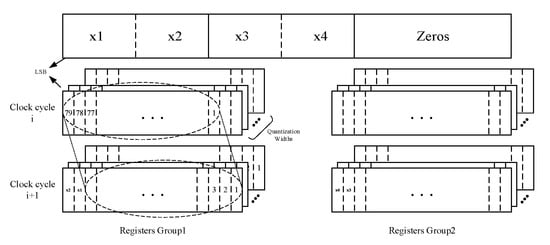 The valid bit length may be cross-block, as shown in Figure 8. This paper adopts a ping-pong structure, two sets of shift registers, and alternately outputs the spliced blocks. As shown in Figure 8, the valid inputs at clock cycle i are x1, x2, x3, and x4, where x1, x2 fill the current block (Registers Group1) by shifting left and x3, x4 shift left to write another set of registers (Registers Group2). In processing the SBs, the symbol bits, and the numeric bits are filled with different values, and two submodules can complete the filling of the symbol bits and the numeric bits, respectively.