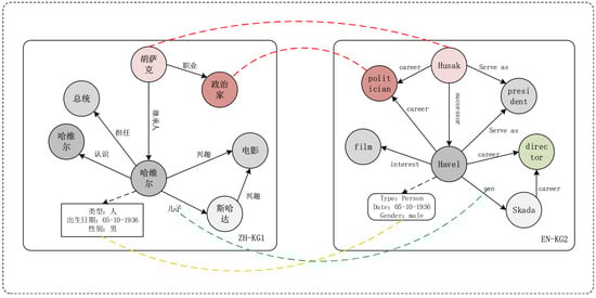 The goal of the entity alignment task [1,2,3,4] has been to find entities that represent the same thing in the real world in multiple knowledge graphs. Formally, it is necessary to establish the relation between these entities and then connect the multi-source and heterogeneous knowledge graphs in order to form a unified knowledge graph, which provides support for various applications based on knowledge graphs. Cross-language entity alignment task refers to the task of finding matching entity-pairs in different languages in a multi-language scenario. For example, the knowledge graphs of different languages are shown in Figure 1. In shown in Figure 1, ZH-KG1 is a Chinese knowledge graph, and EN-KG2 is an English knowledge graph. ZH-KG1 and EN-KG2 not only have different language forms, but they also have different structures. The entities, relations, and attributes in the two knowledge graphs were represented differently by each language.Even if two entities belong to different knowledge graphs, it does not mean that the two entities refer to different things. The “Husak” entity in the English knowledge graph is different from the “胡萨克” entity in the Chinese knowledge graph. However, since they refer to and represent the same concept in the real world, they were regarded as align-able entity-pairs.