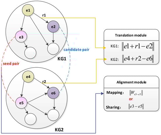 Translation-based approaches have originated from cross-language word-embedding. Therefore, they also have a core assumption that the entity-embedding of different knowledge graphs have similar distributions, similar to the word-embedding of different languages [16,17]. Translation-based methods usually include two modules: a translation module (TM) and an alignment module (AM) [16], as shown in Figure 2. TM usually refers to translation models, such as TransE [5]. AM is usually divided into two different alignment modules: mapping and sharing. The mapping approach embeds different knowledge graphs into a unified vector space through a linear transformation matrix. For example, KDCoE [18] minimized the distances between the pre-aligned pairs by optimizing one or two linear transformation matrices. The sharing approach embeds different KGs into a unified vector space by allowing each pre-aligned pair to directly share the same embedding [17]. For example, MTransE [5] proposed to minimize the equation for each pre-aligned entity-pair.