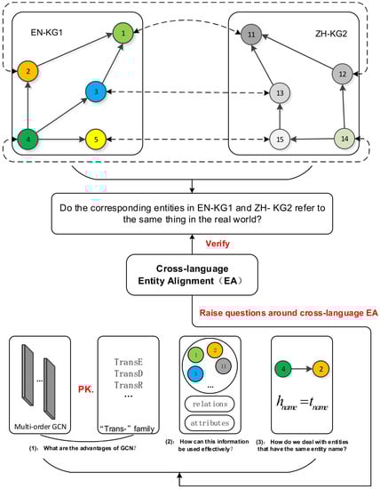 Entity alignment is the process of integrating entities that mean the same thing in the real world, according to different knowledge bases, into a unified knowledge base. Although many entity alignment methods for cross-language knowledge graphs have emerged, there is still a significant amount of advancement required based on the matching scores of similar entities, whether in specific or open domains.Therefore, how to effectively improve the accuracy of similar entities is a hotspot in current alignment-task research. The following questions addressed in this paper concerned cross-language entity alignment: (1) how to exploit the advantages of the GCN in cross-language entity alignment; (2) how to use the entities, relations, and attributes more effectively; and (3) how to handle entities with the same entity name. The problem definition diagram is shown in Figure 3. Without the loss of generality, we implemented the task of entity alignment between the two knowledge graphs KG1 and KG2, based on a set of pre-aligned equivalent entities. Our goal was to identify the equivalent entity-pair between KG1 and KG2.