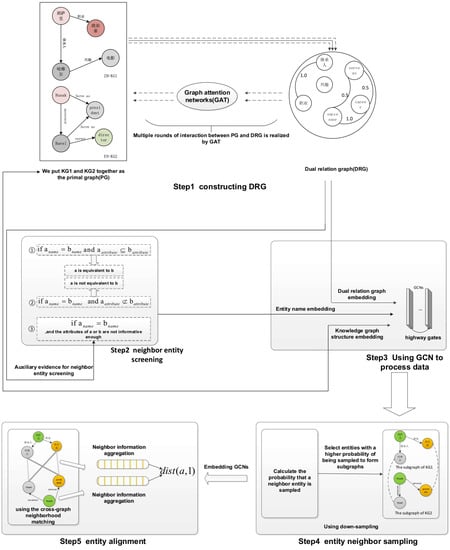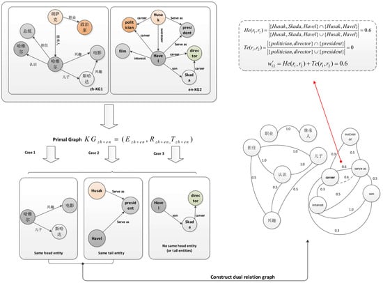 Step 1: Dual-relation graph (DRG) construction. The dual-relation graph used the entity relation as vertex, and an edge was established between the two relations if they shared the same head or tail entity. In order to ensure the obtained dual-relation graph fully included the source and target knowledge graphs, a graph attention network (GAT) was used to ensure the dual-relation graph interacted with the PG for several rounds. The dotted lines in Figure 4 represent multiple rounds of interaction between the PG and the DRG.