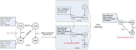 In the task of entity alignment, it was difficult to obtain accurate matching results only by the information contained alongside the corresponding entities in two knowledge graphs. Therefore, it has been typical to rely on the entity’s neighboring entities to provide more useful information to support the implementation of entity alignment. However, the existing methods [26,27,28,29] directly overlooked situations where the head and tail entities had the same entity name in the relation triple when obtaining the neighboring entities of each entity, but this situation could exist in the real corpus. For example, with relational triples , it was obvious that the head and tail entities in this triple had the same name, but it could not be determined that the two entities referred to the same person or thing in the real world. What issues presented when we assumed that two entities were equivalent without comparing their overall information? As shown in Figure 6, we present an example.