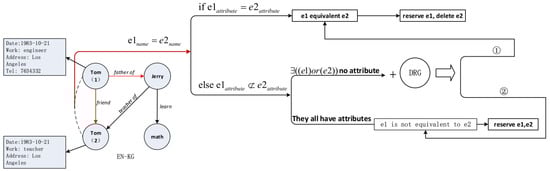 As shown in Figure 7, if entity and entity had the same entity name and their attributes were the same (or there was an inclusion relation), then we considered the two entities to be equivalent and retained entity and deleted entity . If entities and were only the same entity name, and there was no inclusion relation between their attributes, we assumed that the two entities were not equivalent. However, in this scenario, there could be a special case where an entity would not have any attribute information, and we could then use the dual-relation graph as auxiliary evidence for screening. In the dual-relation graph, (1) when the sum of the correlation degrees of all corresponding relations of entity was equal to the sum of the correlation degrees of all corresponding relations of entity , we assumed that the two entities were equivalent. Conversely, (2) if the sum of the corresponding relations was not equal, then we considered the two entities as not equivalent.