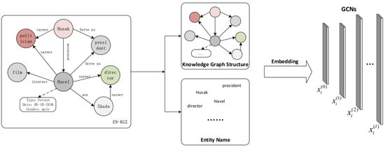 Approaches based on GCN, such as [9,10,25,26,27,28,29,30,31,32,33,34,35,36,37,38], have enhanced the embedding of entities and their neighbors’ information, and they only require a small number of aligned seed-pairs to transfer similar information to the whole graph. As compared to the traditional entity-alignment methods, approaches based on GCNs not only require relatively less human involvement in the process of feature construction, but also such approaches could be extended to large knowledge graphs. GCN applications have typically embedded the data to be processed into a unified vector space [39,40].
