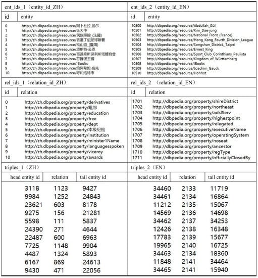 In this paper, we present only part of the data in DBP15K ZH-EN, and the data are presented in the format of the dataset, as shown in Figure 9. In Figure 9, ent_ids_1 and ent_ids_2 represent the correspondence between IDs and entities in the Chinese and English datasets, respectively. Furthermore, rel_ids_1 and rel_ids_2 represent the correspondence between id and relation in Chinese dataset and English dataset, respectively. In addition, triples_1 and triples_2 represent the triples in the Chinese and English datasets, respectively, which were composed of head entity ID, relation, and tail entity ID.