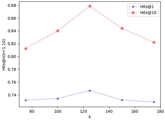 The configuration we used was as follows: = 0.9, and = 1.0, and the neighbor-sampling stage sampled 5 entities for each entity. In order to set a reasonable number of sampling neighboring entities, this paper used samples 1, 5, 10, and 15 for comparison. The experimental results showed that it was optimal when the parameter was set to 5. The matching effect did not change significantly when the parameter was adjusted from 5 to 10, or even 15. However, considering that there were some entities whose number of neighbors would be less than 10, the number of sampled neighboring entities was set to 5. The dimensions of the embedding layer of the primal graph and the dual-relation graph were d = 300, = 600, and = 300. All dimensions of the hidden representations in GCN layers were 300. The learning rate was set to 0.005, and the number of negative samples of each positive one was set to k = 125 (as shown in Figure 10). In Figure 8, when k (k = 75, 100, 125, 150) were different values, the value of Hits@n (n = 1, 10) changed as k changes, and the peak value was reached when k = 125, which was the most appropriate value for k. This study, as well as the literature [9,10,21,32,34,41], used the same training–testing split: A total of 30% of the data were used for training and 70% of the data were used for testing.
