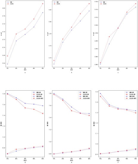 In order to verify the validity of the results in Figure 11a–c, the MR and MRR values were obtained under different SEED values of specific gravity, as shown in Figure 11d–f. As shown in the figure, as the SEED value increased, the value of MR (MRR) continuously decreased (increased), and under the same conditions, the MR and MRR values of the ESGCN were better than those of the NMN. As shown in Figure 11, it was fully verified that our method made a significant contribution to the cross-language entity alignment task, and it also proved the effectiveness of the dual-relation graph and the entity screening for cross-language entity alignment.