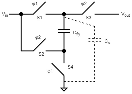 The charge pump, also known as a doubler, is among the most widely used SC circuits. The charge pump has four switches and a flying capacitor Cfly as shown in Figure 1. The operation starts by closing S1 and S4 with one clock phase (φ1), allowing Cfly to charge to Vin. Then, S4 and S1 are opened followed by the closing of S2 and S3 using φ2. Now the capacitor Cfly is connected between Vin and Vout. Since the capacitor Cfly had an initial voltage across its terminals equal to Vin, Vout will have a voltage of 2 × Vin. The output will be lower due to losses from the stray capacitance from the top plate to the ground [13]. Vout at zero load can be calculated as: